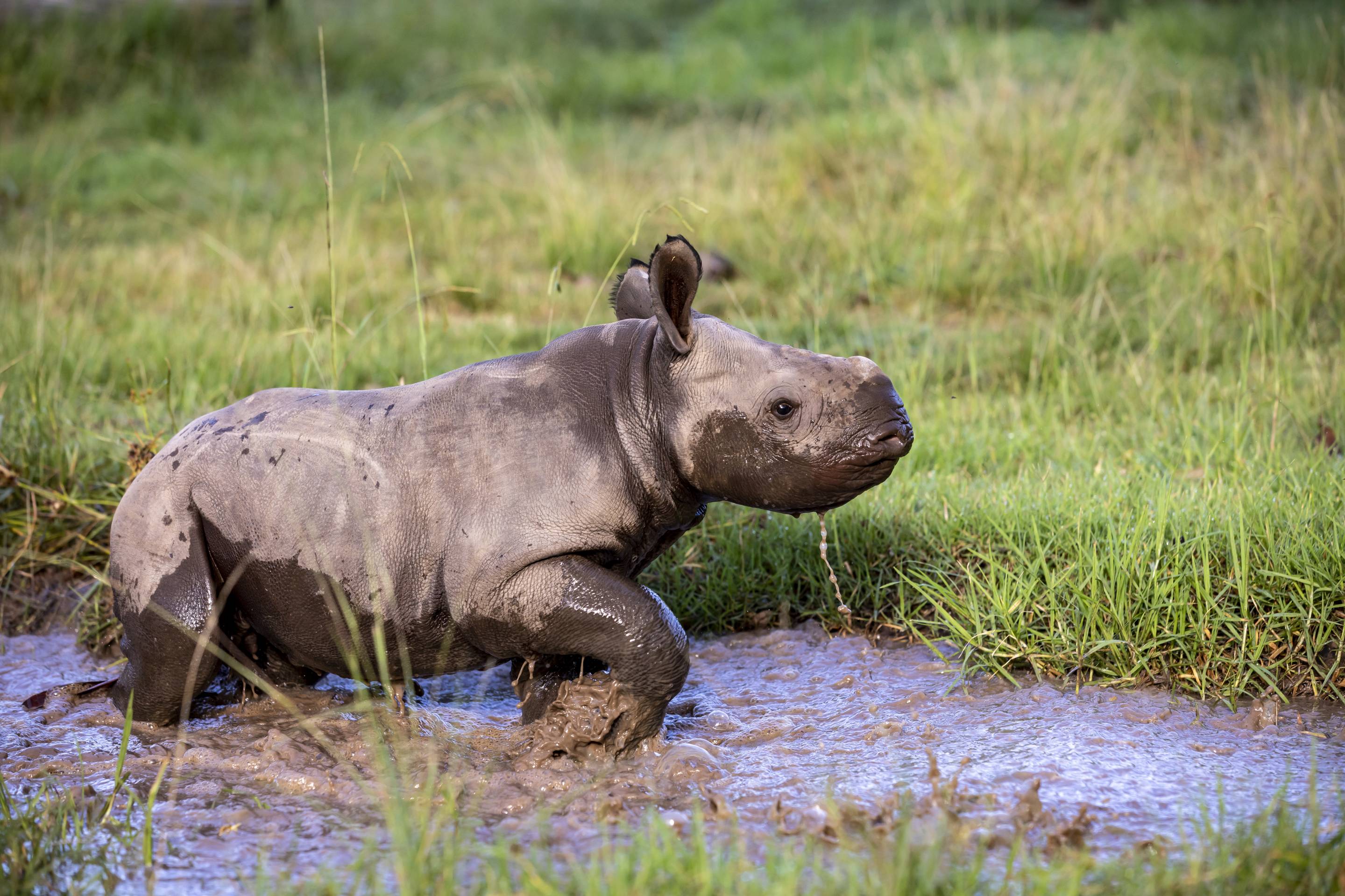 Taronga Western Plains Zoo’s Black Rhino calf has had its first mud bath, frolicking with mother Bakhita in the muddy conditions produced by recent rainfall in Dubbo.