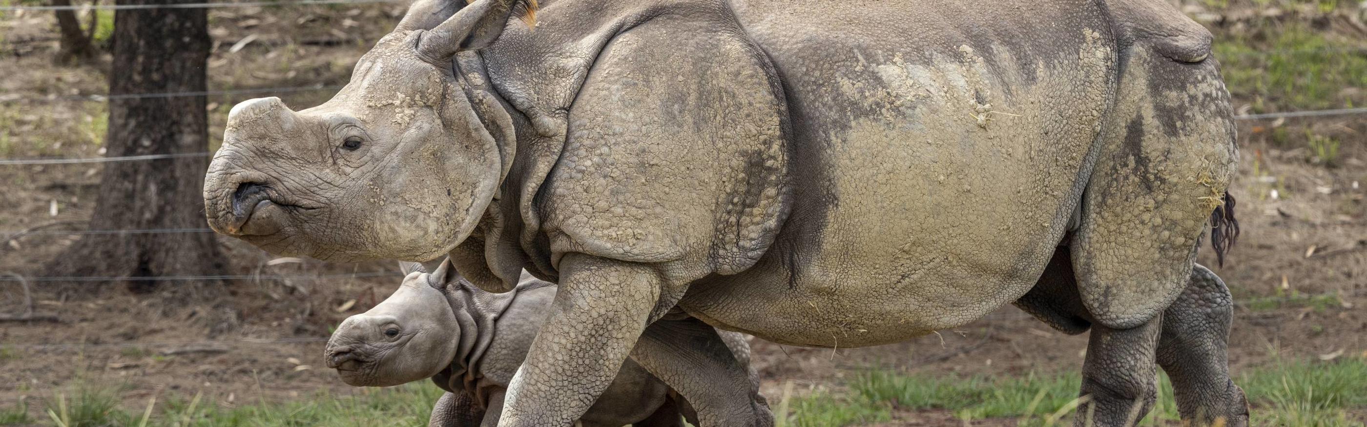 Eight week old Greater One-horned Rhino calf Hari has made his public debut alongside his mother Amala, as the pair explore a large paddock visible to guests at Taronga Western Plains Zoo in Dubbo.