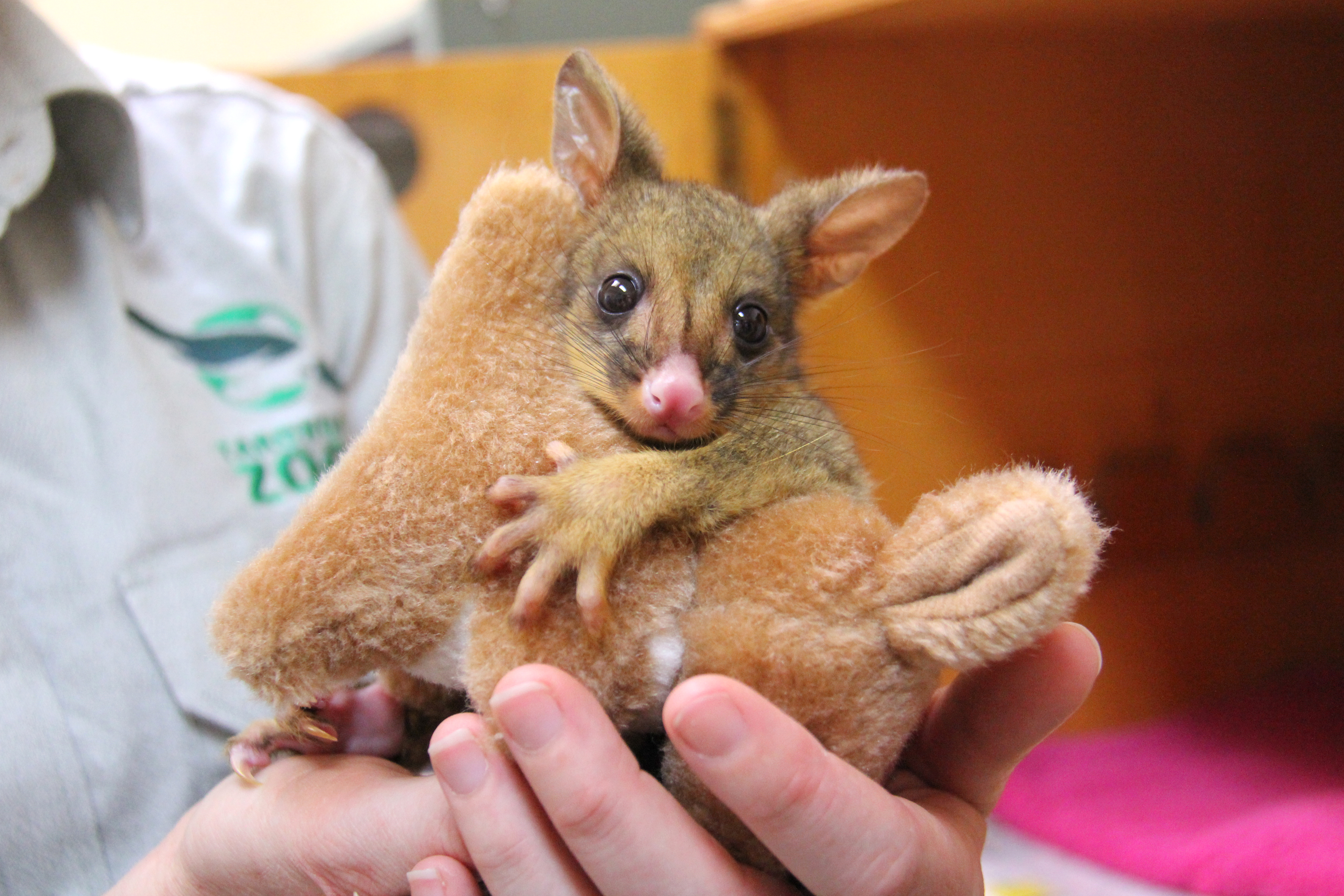 A Taronga Zoo vet nurse is providing round-the-clock care to an orphaned Brushtail Possum joey – with a little help from a soft toy kangaroo!