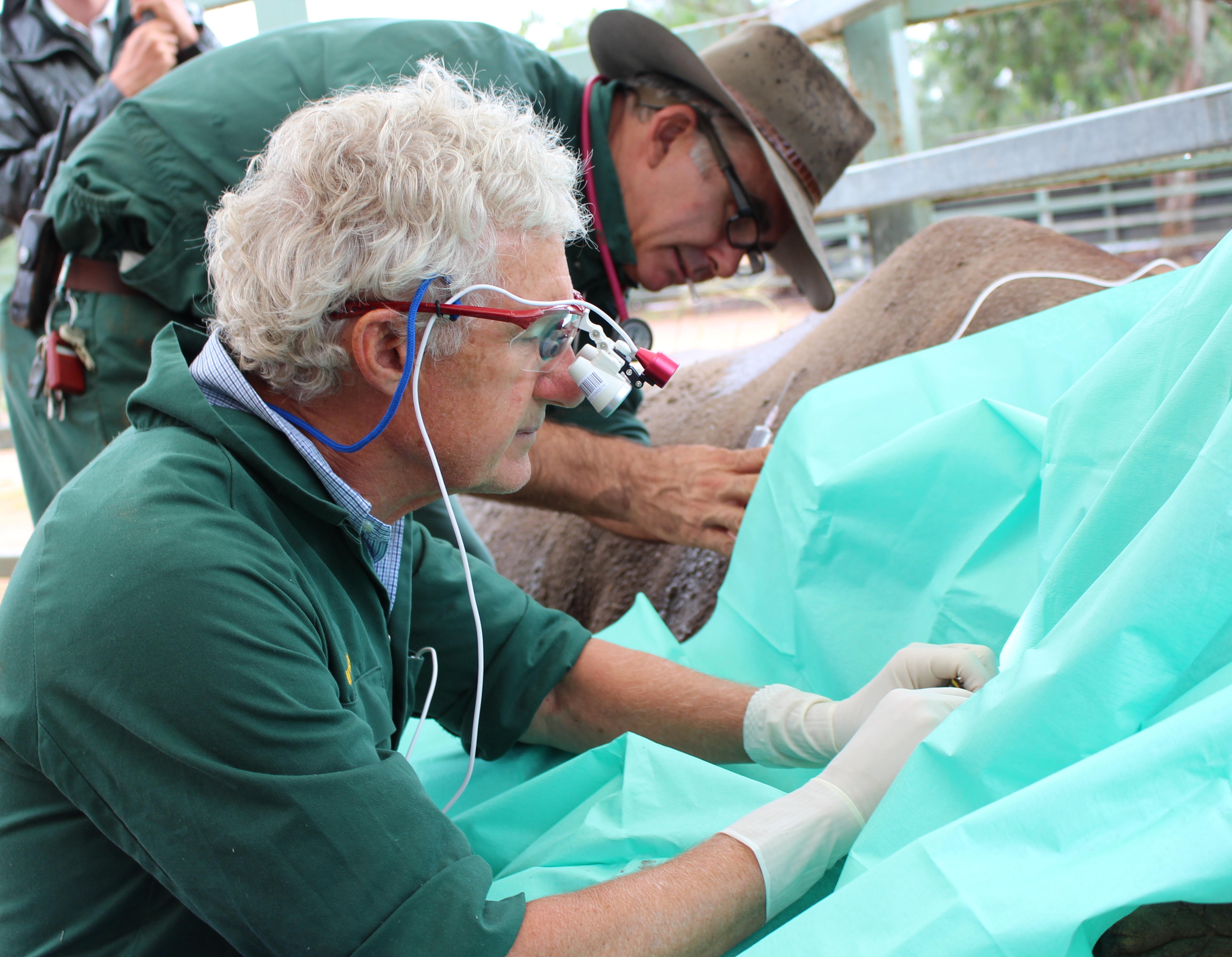 Taronga Western Plains Zoo’s Black Rhino breeding male, Kwanzaa had recently developed a problem with his eye. Keepers and vets had been monitoring the progressive corneal ulcer and providing treatment, but it continued to worsen despite the intensive medical attention. The Zoo enlisted the help of Specialist Veterinary Ophthalmologist, Dr Jeff Smith from Sydney to assist with the delicate operation. Dr Smith has assisted both Taronga and Taronga Western Plains Zoo in the past with a number of procedures on animals such as Guanaco, Galapagos Tortoise, Seals and Tapir. Dr Smith conducted surgery on the eyeball to repair the ulcer out in the field on what was a very rainy day for Dubbo. The procedure was a delicate and complex surgery on the cornea itself using surgical magnification and specialised instruments. The surgery went well with the ulcer being repaired and patched with a corneal sliding graft.If the ulcer was left untreated it could have resulted in ruptured and collapsed the eyeball which would have caused permanent blindness and pain for Kwanzaa.Kwanzaa’s eye is being managed with post-operative medication. Staff expect him to make a full recovery and be back to his role as one of the key breeding males at the Zoo in no time.