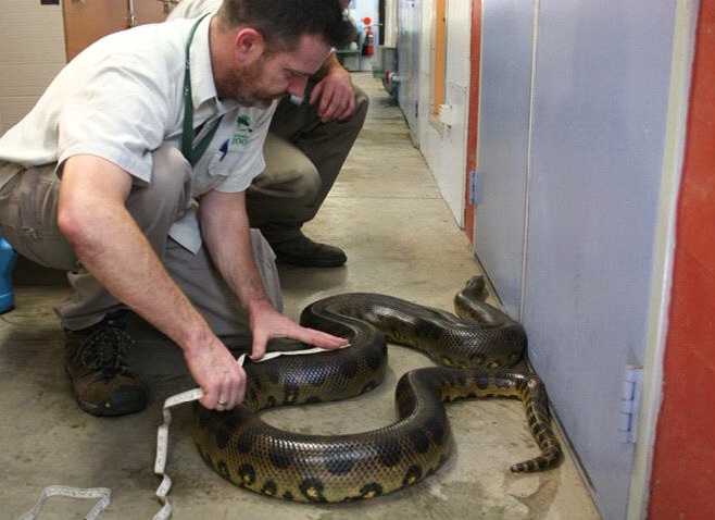 We have two Green Anacondas at Taronga Zoo, one of which is on display for visitors to see in our Reptile House. These two snakes came to us in 2005 from the USA, weighing less than two kilograms each.