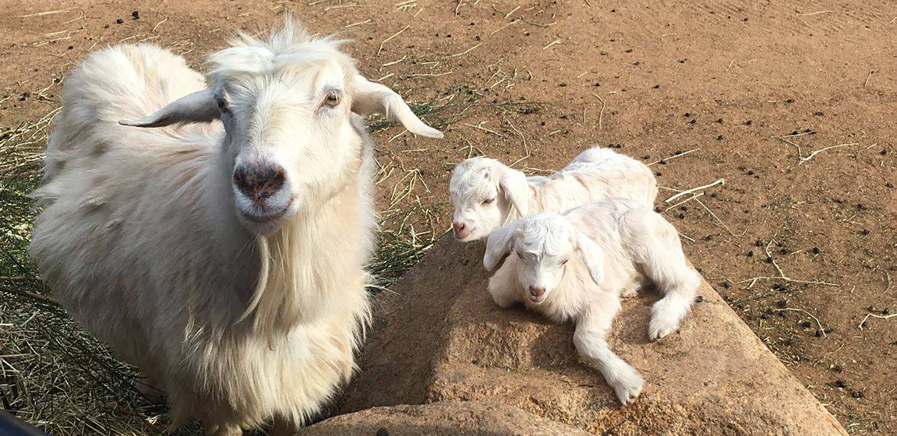 The twins are part of a herd of nine adult goats and 13 offspring. The goat family has already adjusted to the arrival of the new twins, and the babies themselves are even beginning to play with the other young kids.