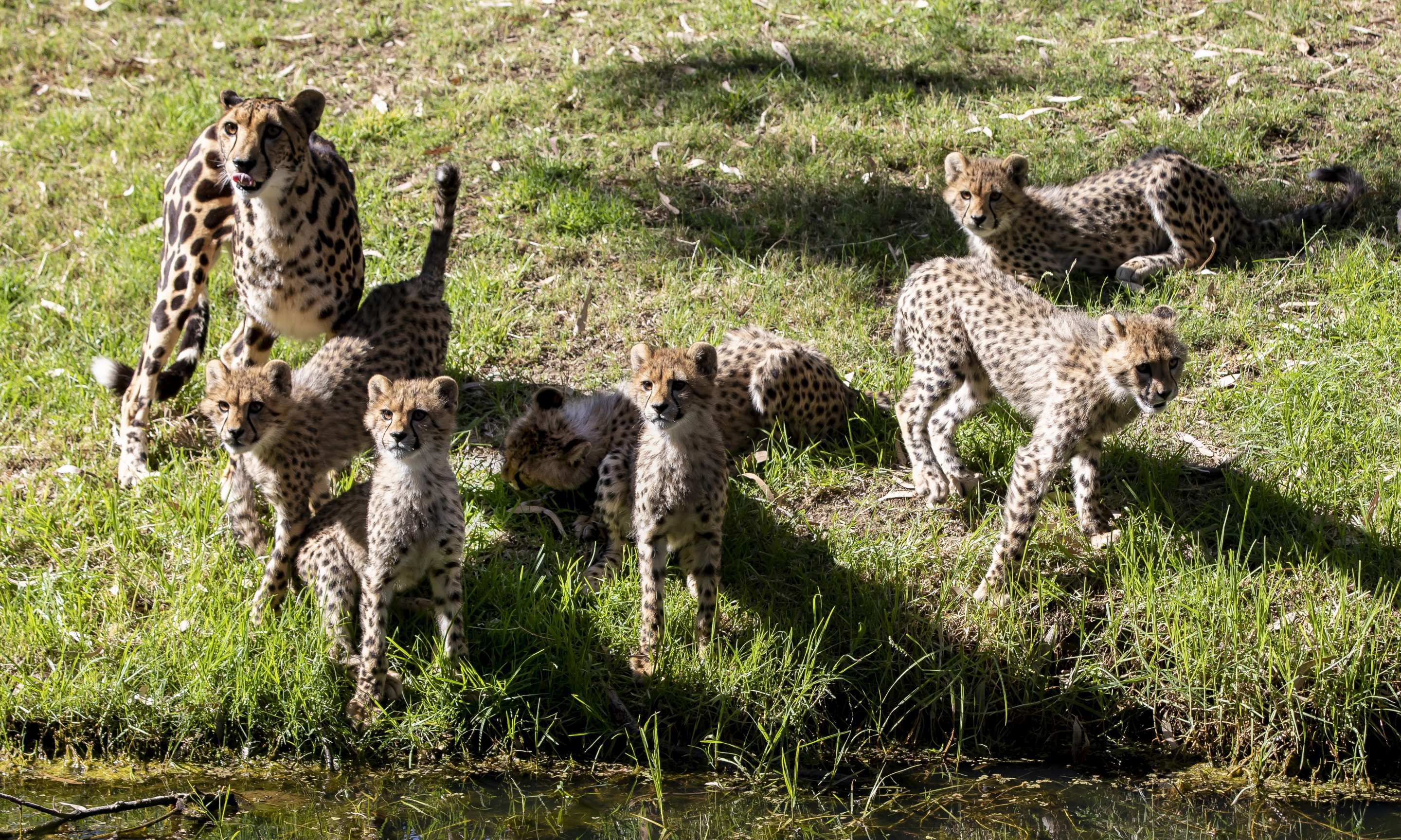The cubs are also starting to really look more elongated as they look more and more like mini Cheetah. Over the coming months their stalking and ankle tapping skills will continue to be prominent as they fine tune their hunting skill instincts as would happen in the wild. For this they are practicing on each other and also on a very tolerant mum. Like most cats, the cubs react to movement – be that birds flying low and close by or watching the long-necked turtles swimming in the moat from the shoreline.